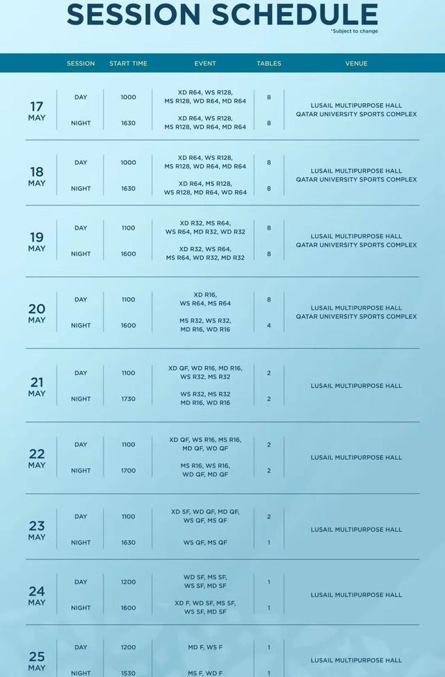 除提前抽签外,本届世乒赛还有许多新的变化,举例使用红色球台,这就需要拿出时刻去符合,虽然争议最大的还是赛程,多哈世乒赛在5月17日至25日举办,其中混双决赛是5月24日21点,女单和男双(17点)、男单和女双(20点30分)王人在5月25日进行,因为阻隔太短显得至极病笃。