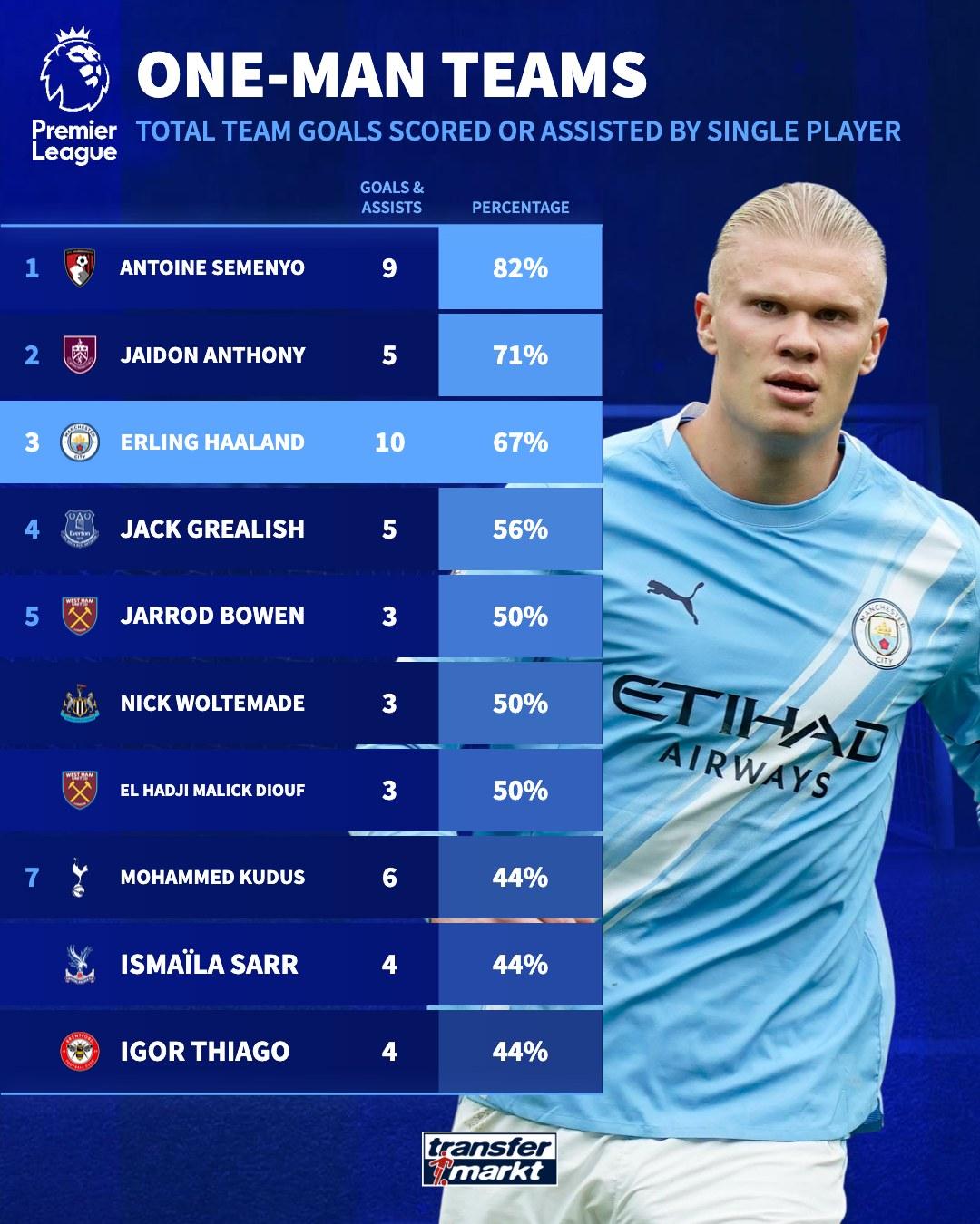 虎扑10月05日讯 德转数据统计,本赛季英超单个球员参与球队进球数占比,塞梅约82%居首体育最新信息,哈兰德第三。