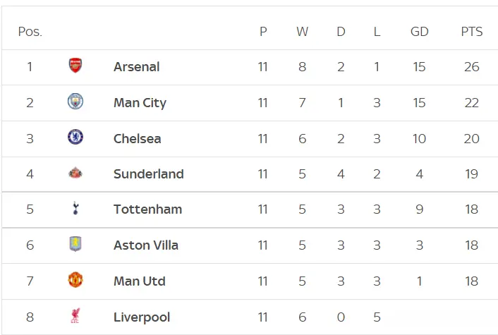 11轮之后,曼城以22分排行第二位,阿森纳以26分排行榜首,而卫冕冠军利物浦以18分排行第8位,甚而比曼联还低了一位。