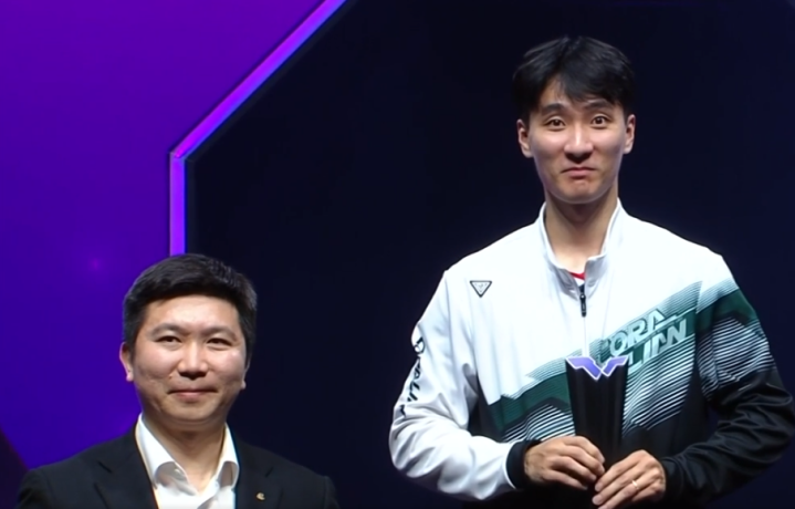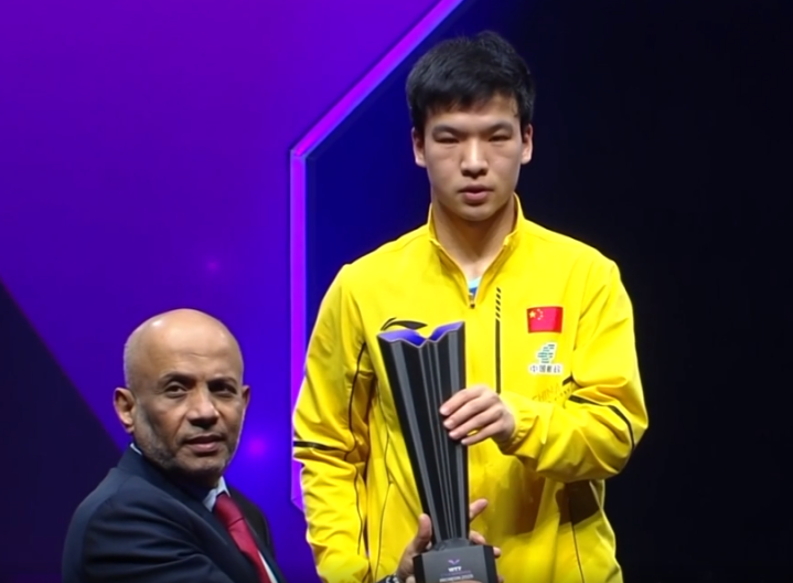 率先是给亚军受奖,由韩国乒协主席、奥运会冠军柳承敏给李尚洙受奖。一切成功。